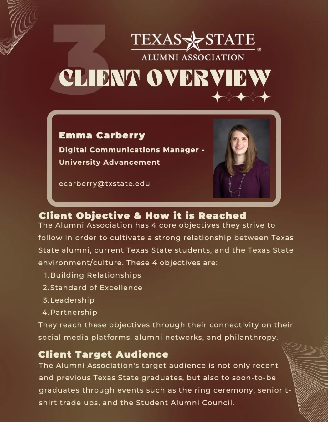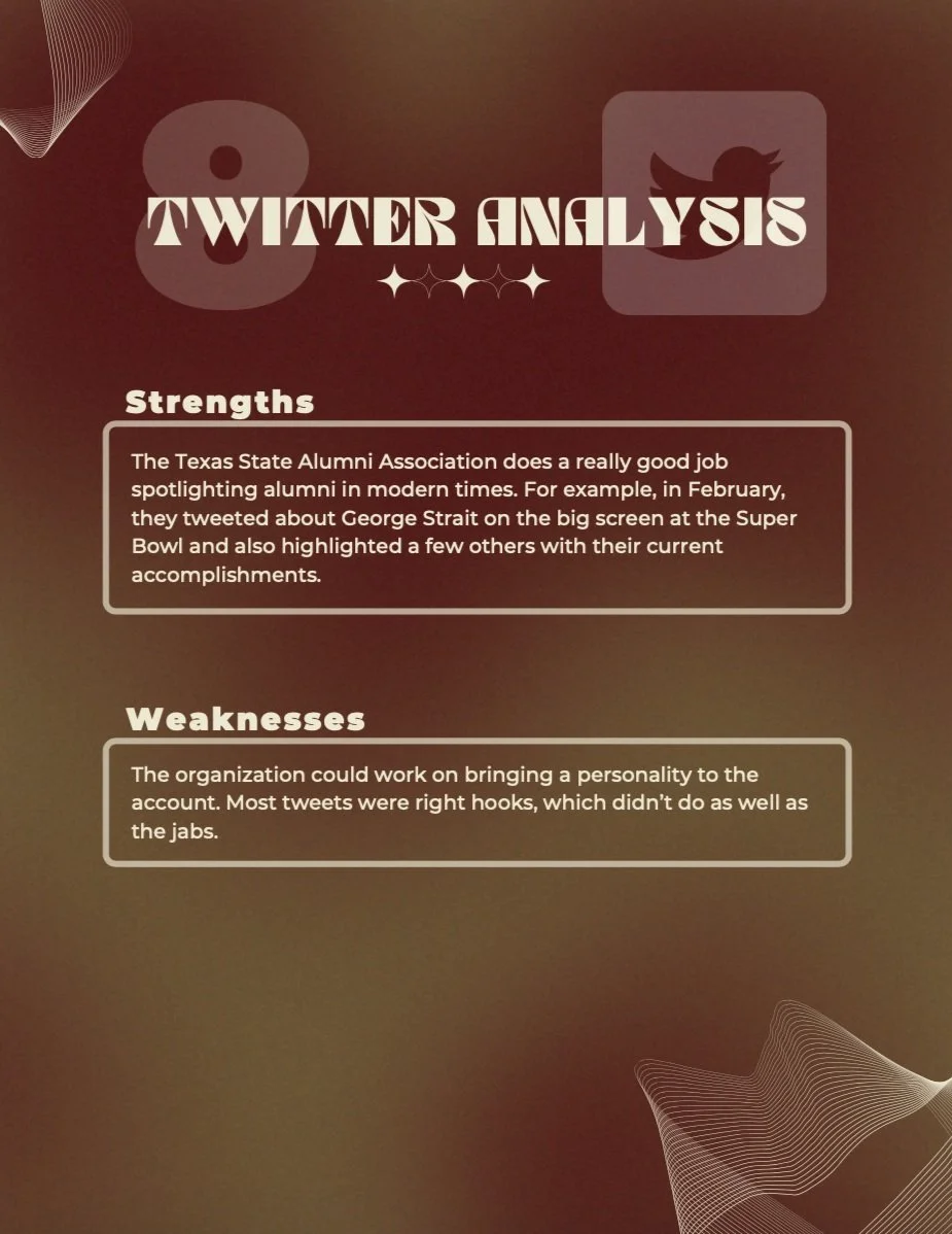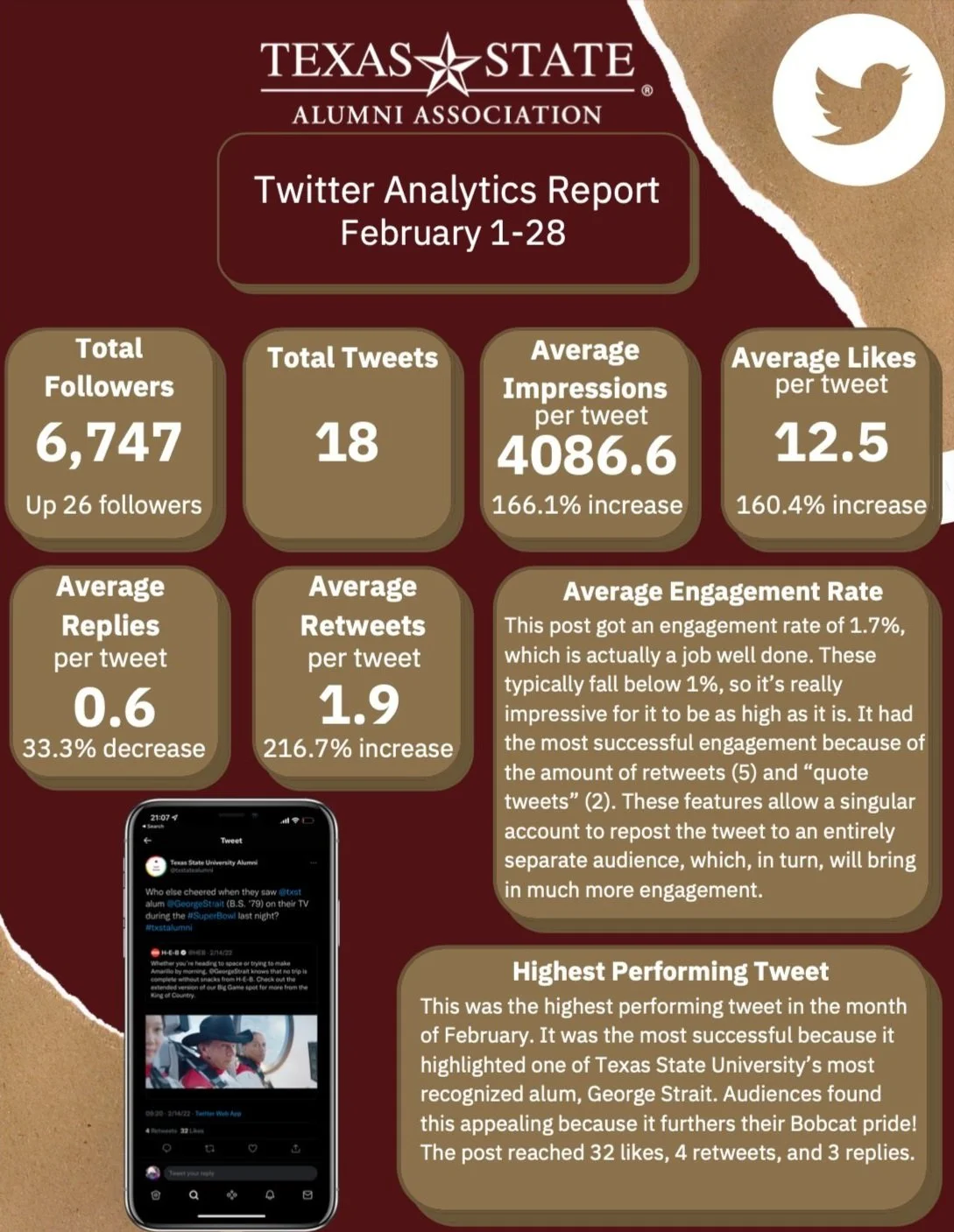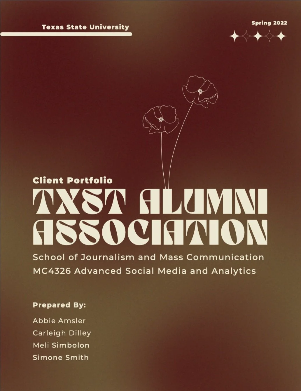 This client portfolio contains monthly analytic status reports of Texas State University’s Alumni Association’s social platforms over three months. While reviewing the client’s Facebook, Twitter, and Instagram, the highest or best-performing posts from each platform were analyzed.
