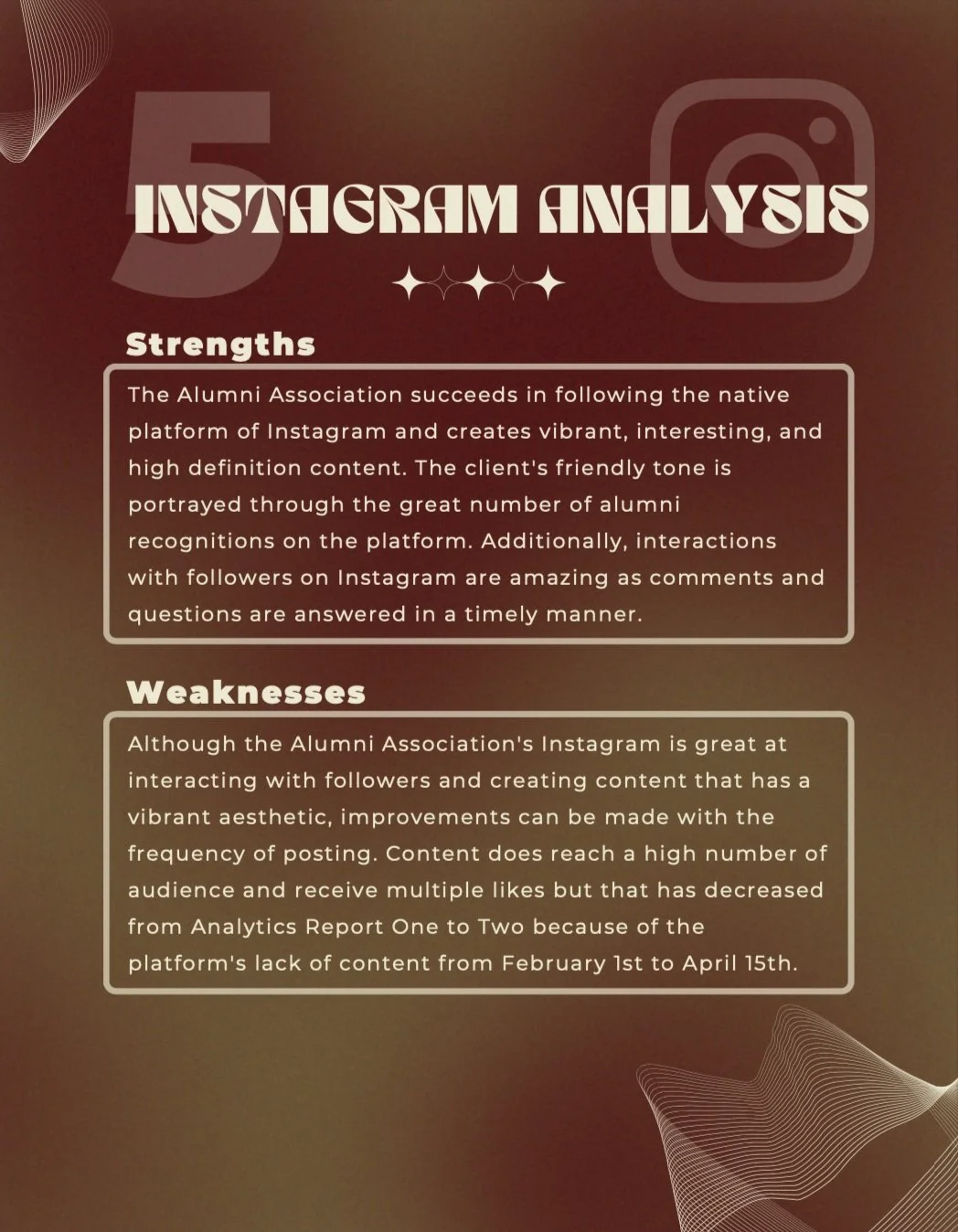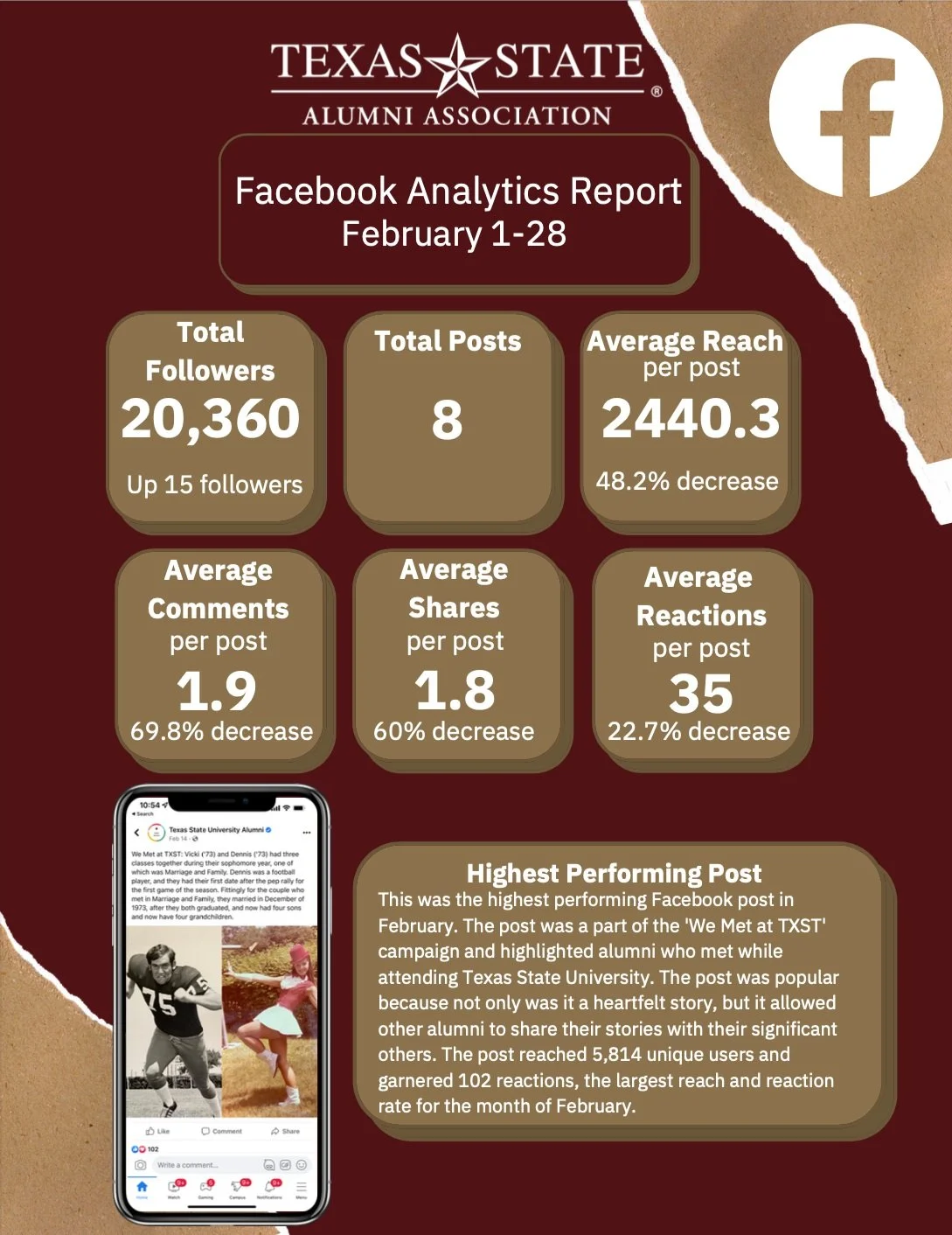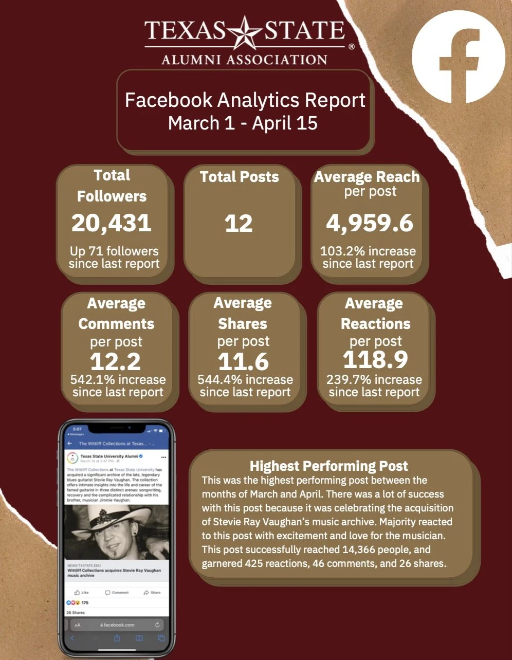 This client portfolio contains monthly analytic status reports of Texas State University’s Alumni Association’s social platforms over three months. While reviewing the client’s Facebook, Twitter, and Instagram, the highest or best-performing posts from each platform were analyzed.